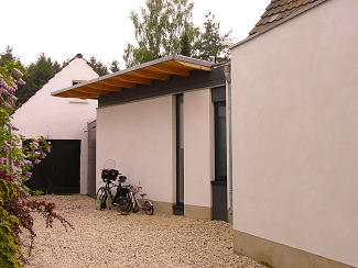 Dem Wohnhaus aus den 30er Jahren wurde Anbau als verbindendes Element zum bestehenden Garagenhaus hinzugefügt. Der Eingang wurde mit einem neuen Windfang von der Rückseite nach vorne orientiert. Die Anbauten heben sich durch die moderne Formensprache deutlich vom Hexenhausstil des Bestandes ab. Die Fuge zum Wohnraum wurde durch Fensterschlitze und Dachrücksprung thematisiert.
