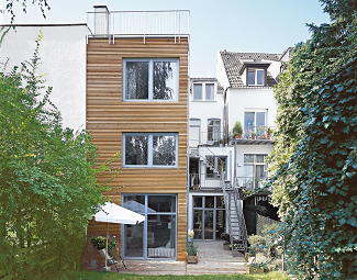Das Gründerzeithaus wurde saniert und gartenseitig um einen modernen Anbau mit Holzverkleidung erweitert. Durch die Maisonetteausbildung und den geschosshohen Geländesprung, der eine Wohnraumnutzung im vormaligen Kellerbereich ermöglichte, konnte das Haus in 3 Wohneinheiten aufgeteilt werden.